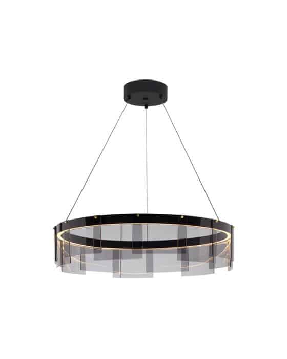 The Stratos 30 Chandelier is a modern statement piece featuring an architectural play of form and light. Vertical glass panels create a graphic pattern around the circular LED source, casting a soft and even illumination. The suspended design, supported by slim cables, gives the fixture a light and contemporary presence, ideal for dining spaces, living rooms, or open entryways.A striking chandelier that blends clean geometry, modern technology, and decorative elegance.